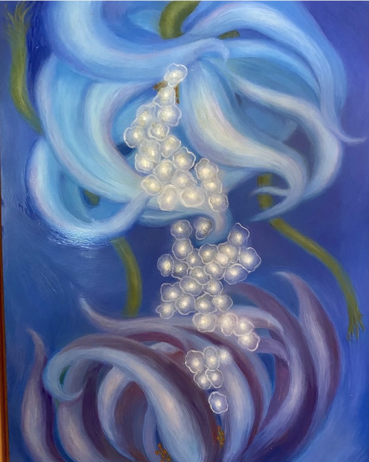 After painting detailed botanical and surreal studies of nature, the prospect of creating conceptualized waterscapes in a minimalist style was a welcome relief. The mood was contemplative and Zen. I was drawn to the simplicity of form presented with rich surfaces and impressionistic brush strokes that allowed me to relax. Waterfalls have always mesmerized me with a sense of the power of nature and the sublime. They carry a symbolic story of purification and baptismal cleansing which easily washes away the clutter of 21st century living. In the West they are sadly becoming rare sights due to drought and climate change. I have used photos, film and memory to construct these imaginary scenes which I hope give a glimpse of what Petrarch described as giving “…even the sluggish soul a rise to the noblest concerns”.